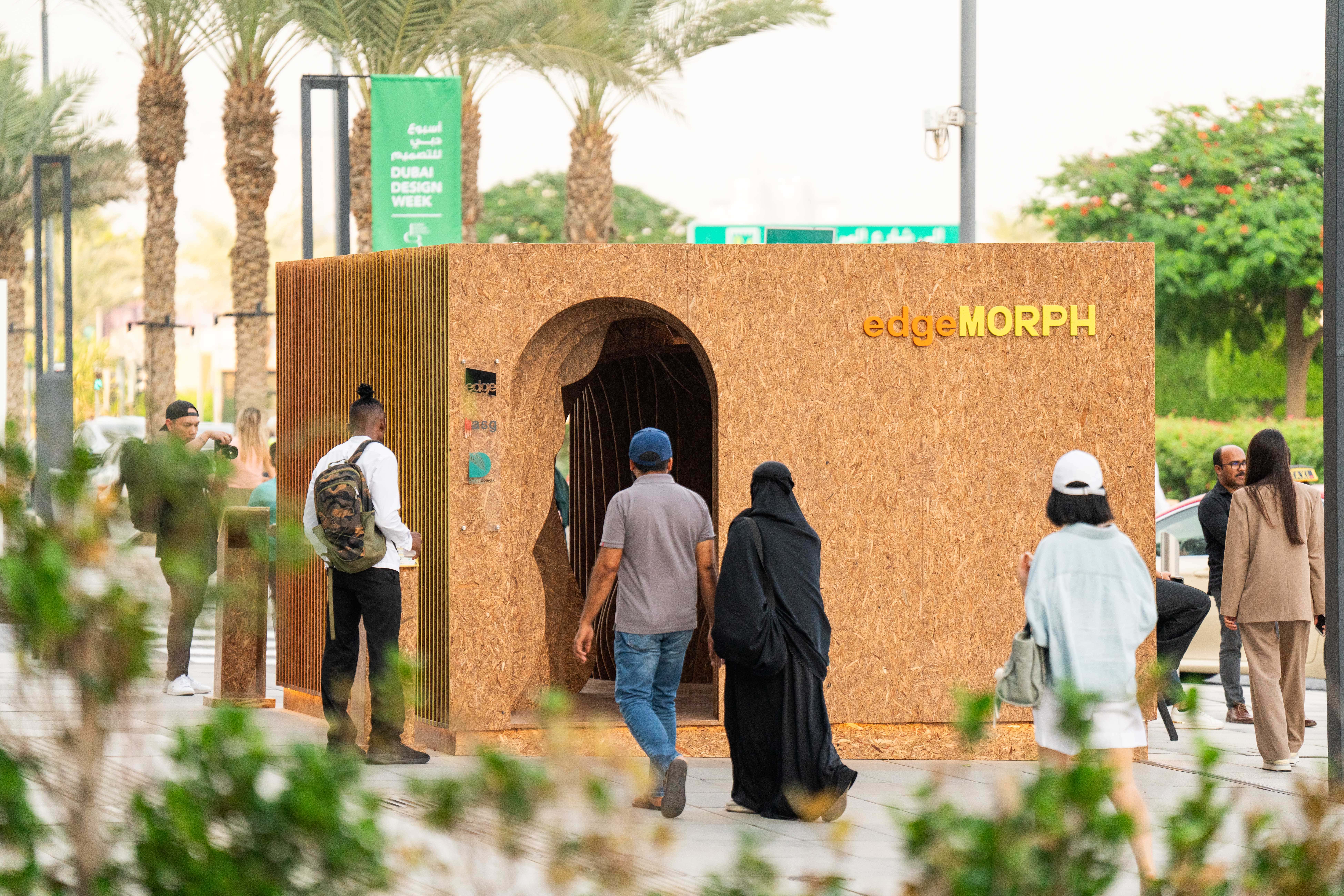 edgeMORPH was constructed entirely from Palm Strand Board (PSB®), an engineered material manufactured in the UAE using the bio-ecological residual mass of palm fronds. The installation showcased the material’s structural and aesthetic potential while highlighting an alternative to conventional construction materials.