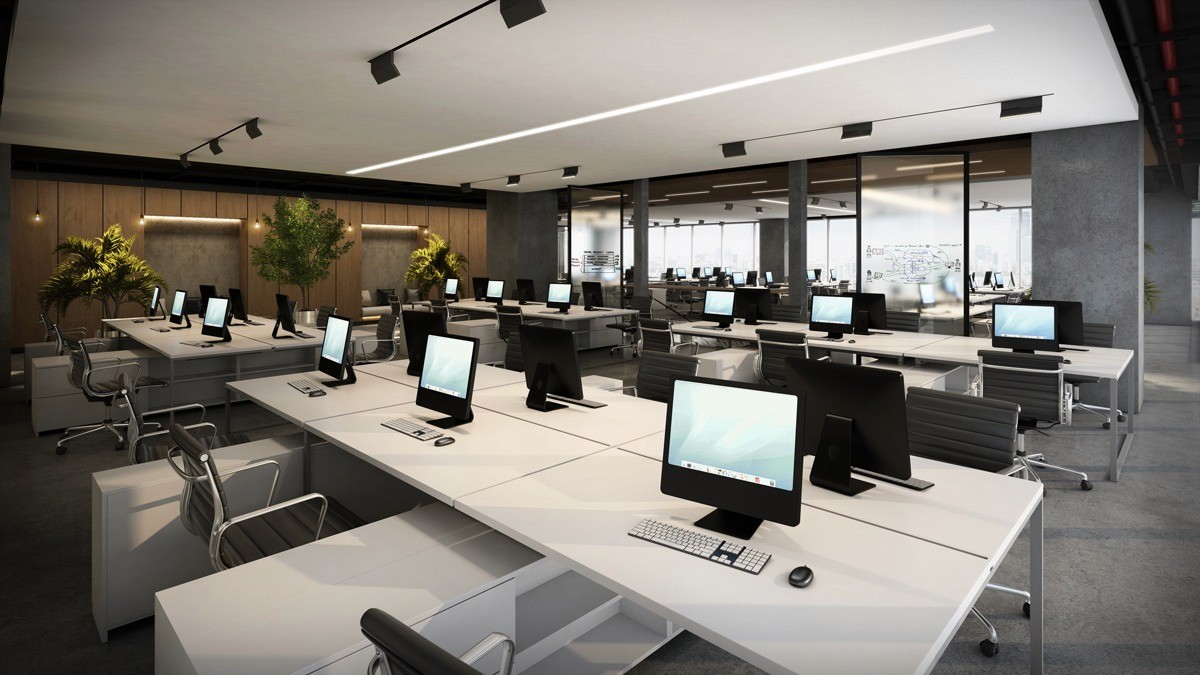 A restrained, monotone colour palette defines the overall design language. Grey concrete finishes, white workstations, and black-framed glass partitions are combined with warm wood accents to create a sophisticated and contemporary minimalist interior aligned with the client’s aesthetic sensibilities.
