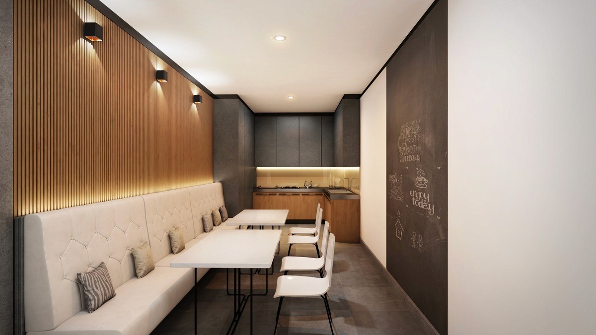 Designed as a space for staff to dine and unwind, the pantry features restaurant-style upholstered seating, wood slatted wall finishes, and a blackboard wall for informal staff interaction.